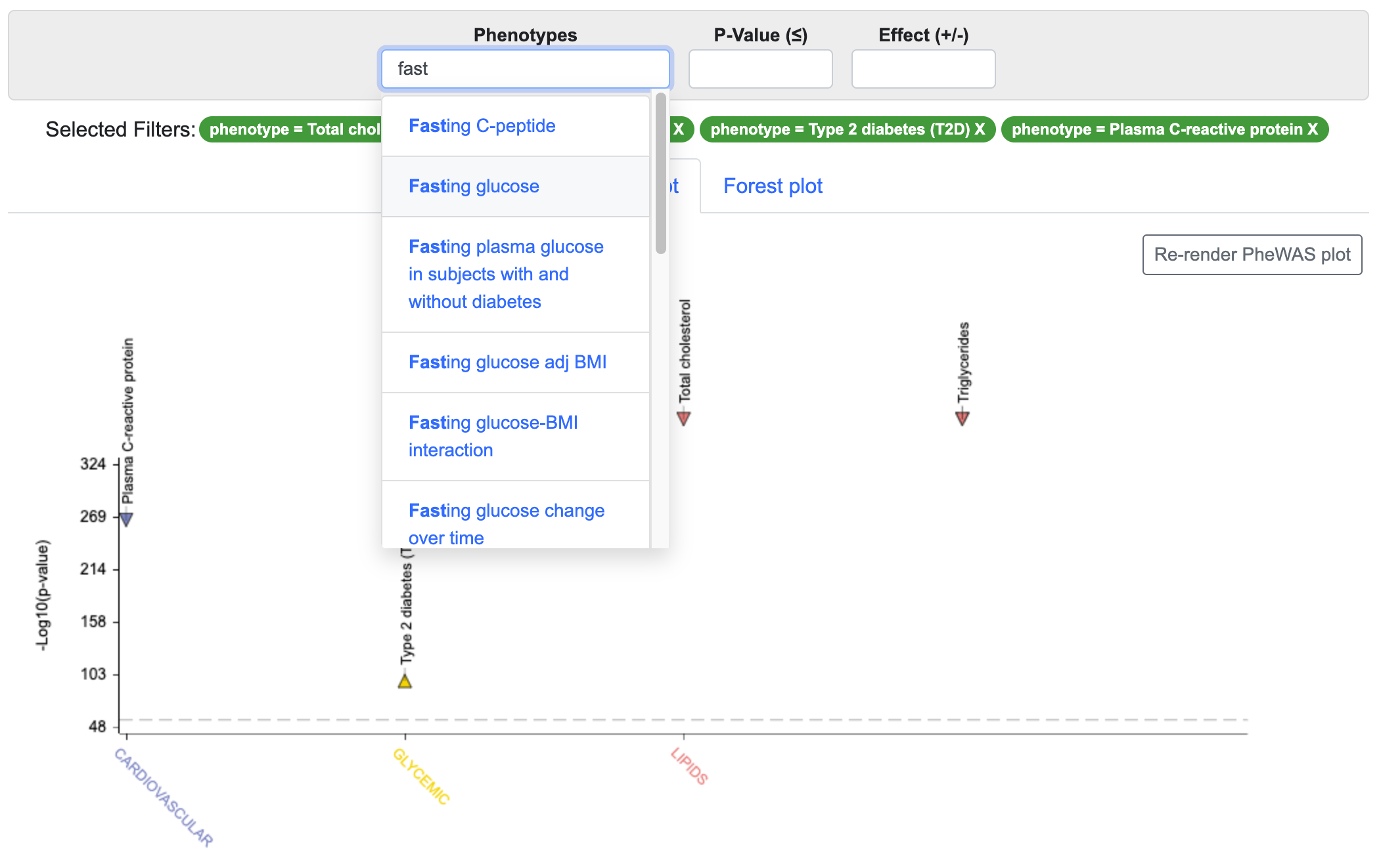 Using the Phenotypes search box above the plot, you can select as many phenotypes as desired and filter the plot and table to display only those phenotypes. You can also set a p-value threshold and select positive or negative direction of effect.